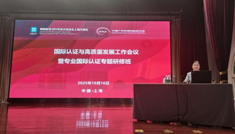 10月13日-16日,“国际认证与高质量发展工作会暨专业国际认证专题研修班”在上海科学会堂成功举办。本次会议由德国教育与科学技术促进会和中德产学研用创新联合体牵头主办。我校机电工程学院院长卢纪丽受邀作了ASIIN认证经验交流发言,第二批拟申报ASIIN认证的相关学院专业负责人和骨干教师参加会议。